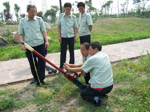 7月9日上午,省防汛抢险队在汾河滩演练抢险器材,交通部中国海洋工程公司的技术人员现场指导培训省防汛抢险队队员进行抛缆枪练习弹和实弹演练。