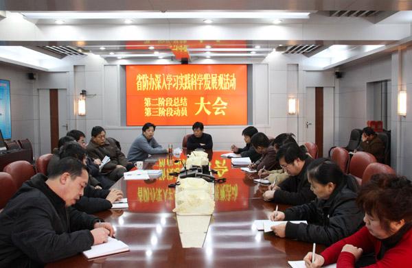 本站讯:1月15日下午,省防办召开深入学习实践科学发展观活动第二阶段总结第三阶段动员大会。会议全面总结分析了防办第二阶段的各项工作。会议强调,第三阶段是整个学习实践活动的核心环节,在这一阶段要抓好三个环节的工作:一是要制定整改落实方案;二是要集中解决突出问题;三是要完善体制机制。要按照厅里的部署,切实加强组织领导,严格整改责任,处理好进度与质量的关系,统筹兼顾、力争做到“两不误、两促进”。