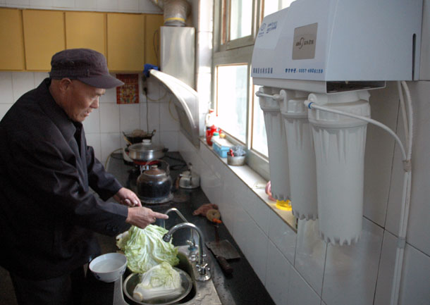 11月2日,山西翼城冶南村64岁农民高玉进在使用经过氟水过滤器处理过的地下水洗菜。