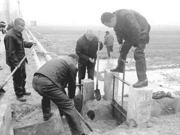在师村,村民们正在疏通渠道,为自家的小麦进行冬浇。 本报记者/畅雪/摄
