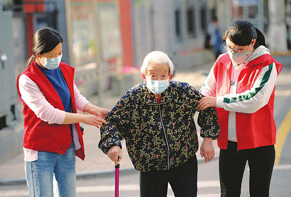 5月19日,太原市桃园南路第一社区党建微帮站志愿者正在搀扶老人散步。自该站建立以来,20余名党员志愿者积极发挥党员先锋模范作用,帮助居民解决生活中遇到的难题。 记者 史晓波 摄