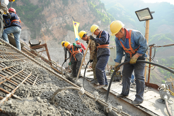 在板涧河水库,一线建设者正在坝宽195米、坝高85米、坡比1:1.4的大坝坡面上热火朝天地进行混凝土面板浇筑。板涧河水库位于运城市垣曲县板涧河村下游约1.5公里处,是山西大水网骨干工程之一——小浪底引黄工程的调蓄水库,水库主要作用是在黄河小浪底水库汛期调水调沙运行期间,保障小浪底引黄工程为运城垣曲、闻喜、绛县、夏县、盐湖等五县(区)不间断供水。水库大坝为混凝土面板堆石坝,总库容3300万立方米,