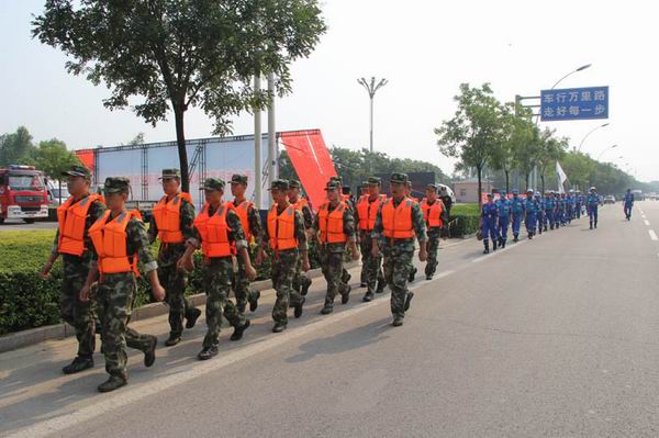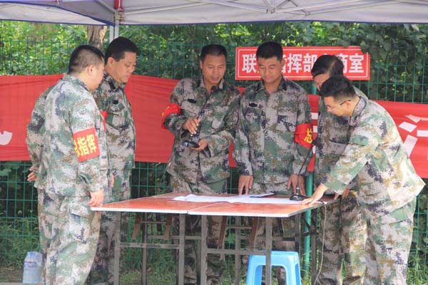 应急演练模拟的背景是,受副高边缘暖湿气流影响,孝义市出现入汛以来最强降雨,全市大部分地区出现暴雨,降雨量已达300mm,水库水位急剧上涨,已达汛限水位764米,张家庄水库上游河道爆发大量洪水,孝河湿地公园已经组织疏散游客,人员撤离,对重要设备、资产、电瓶车等进行了撤离,同时,橡胶坝已塌坝,巡查人员正在密切关注水情、工情,并启动了防汛应急预案,湿地公园已全面封园。