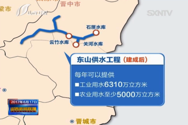 东山供水工程是两纵十横“大水网”第五横,主要是从晋中东部太行山区的石匣水库、云竹水库、关河水库等四个地方取水,调到汾河流域晋中盆地,给人口稠密、工业较为发达的太谷、祁县、平遥、介休和灵石5个县市供水,工程输水线路全长258公里。建成后每年可以提供工业用水6310万立方米,农业用水至少5000万立方米,将有效缓解5县市缺水之渴。