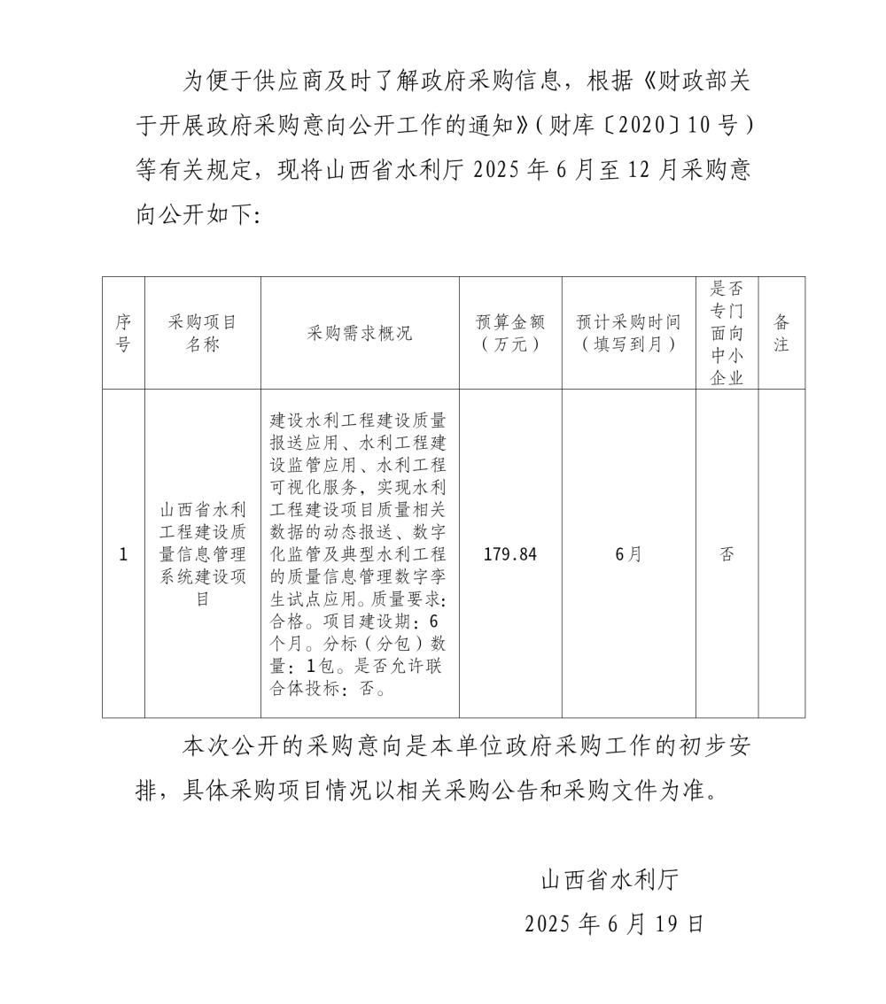 信息名称:山西省水利厅2025年6月至12月政府采购意向